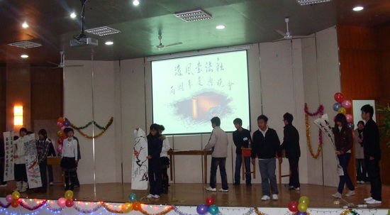 晚会在气势磅礴的中华武术表演中拉开了帷幕。紧接着歌舞、小品、现场书法、魔术等一系列精彩节目先后登场,其间还穿插了与观众互动交流的抽奖环节,逸风书法社成员现场书法作画更是将晚会推向了高潮。 晚会开始前,高润霞处长接受了《秦潭学子》记者的采访,她说,书法是一门艺术,是中国传统文化的象征。练习书法可以提高同学们的个人艺术素养,还能修身养性。举办此类活动能丰富同学们的课余文化生活,也给大家提供了一个展示才艺的舞台,希望同学们能持之以恒,积极练习书法,继承和发扬中华民族传统文化。