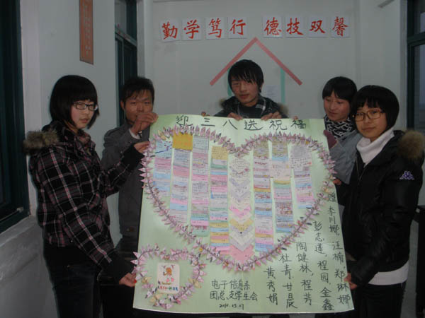 为隆重庆祝“三.八”国际妇女节100周年,学习雷锋感恩精神,38日,我院机电工程系团总支、学生会筹办了一场“奉献爱,送鲜花”大型活动。以此来表达对我院全体女老师的节日问候,同时感谢她们对学院、学生做出的奉献;电子信息系在2号教学楼大厅开展“童年记忆,我的涂鸦送母亲”活动。同学们以饱含深情的笔,绘就了“十月怀胎”、“妈妈,节日快乐”“感恩母亲”等图文,充分表达了对母亲无限热爱和感激之情。