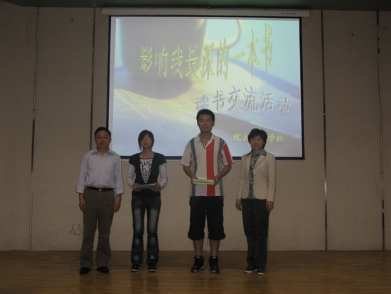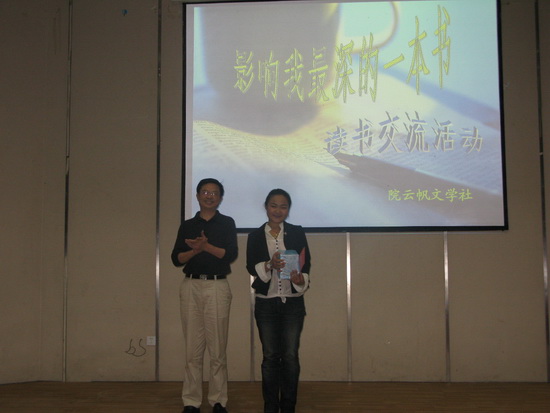 院云帆文学社于2010年5月17日晚7:00在图文信息中心一楼大报告厅举行了以“影响我最深的一本书”读书交流活动为主题的演讲比赛。演讲比赛共有15名参赛选手,分别由各系部文学分社推选。院党委委员、副院长施运华莅临了比赛现场,观看整场比赛。担当此次比赛的评委有学生处处长高润霞、副处长彭金德、团委副书记余锋、许咏梅老师、王晓林老师、文学社指导老师张铮老师。 比赛中,选手们将演讲和PPT展示相结合,使得演讲更富有看点与激情。选手们的良好表现,台下时时掌声雷动,现场气氛相当热烈。比赛结束后,高润霞处长 |