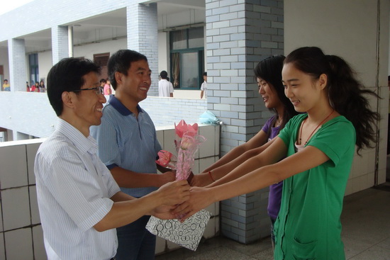 秋风送爽,桃李芬芳。在这收获的金秋时节,我们迎来了第二十六个教师节。9月10日早7:30,老师们刚踏下校车,就收到了等候在校门口同学们的鲜花和祝福。7:50,课堂上,同学们手拿鲜花赠给我们最可敬的人――默默无闻奉献的老师。此外,近日来,老师们收到的祝福短信、EMAIL不断,老师们脸上洋溢着幸福的微笑。