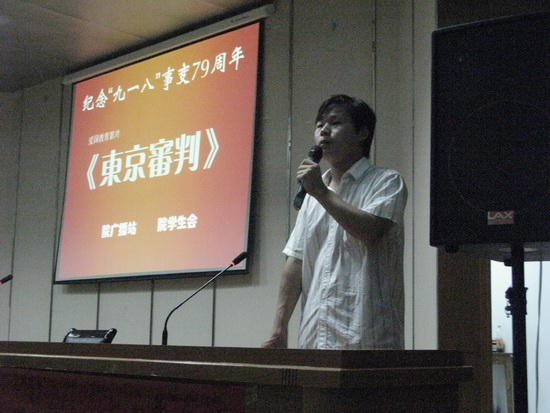 当晚,图文信息中心一楼报告厅座无虚席,近600名同学认真观看了爱国教育电影――《东京审判》。观看完该片后,同学们反响极其强烈。纷纷表示:“作为一个中国人,都应该铭记这段历史,时刻不忘国耻,振兴中华,从我做起,决不让历史在今天重演。