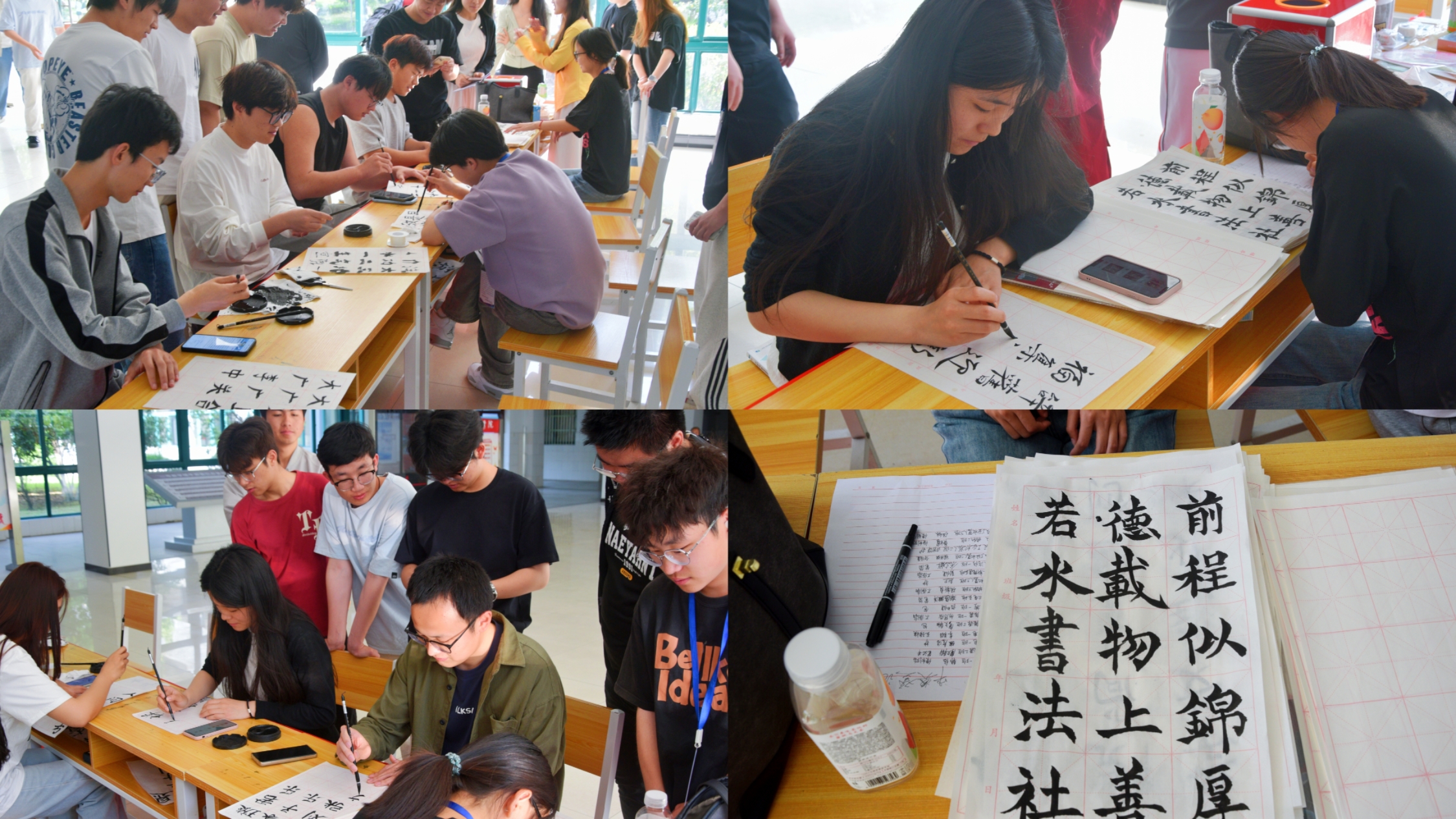 4月18日,机电工程学院团总支学生会在1号教学楼大厅组织沉浸式书法体验活动,邀请师生书写励志箴言与诗词名句。为增添体验趣味,活动现场还精心设置了“书写即抽奖”趣味环节,吸引了众多学生驻足参与,纷纷执笔感受书法艺术的独特魅力。现场墨香萦绕,顷刻间,千年文脉仿佛在笔锋流转间悄然苏醒,浓厚的传统文化氛围在现场充分洋溢。