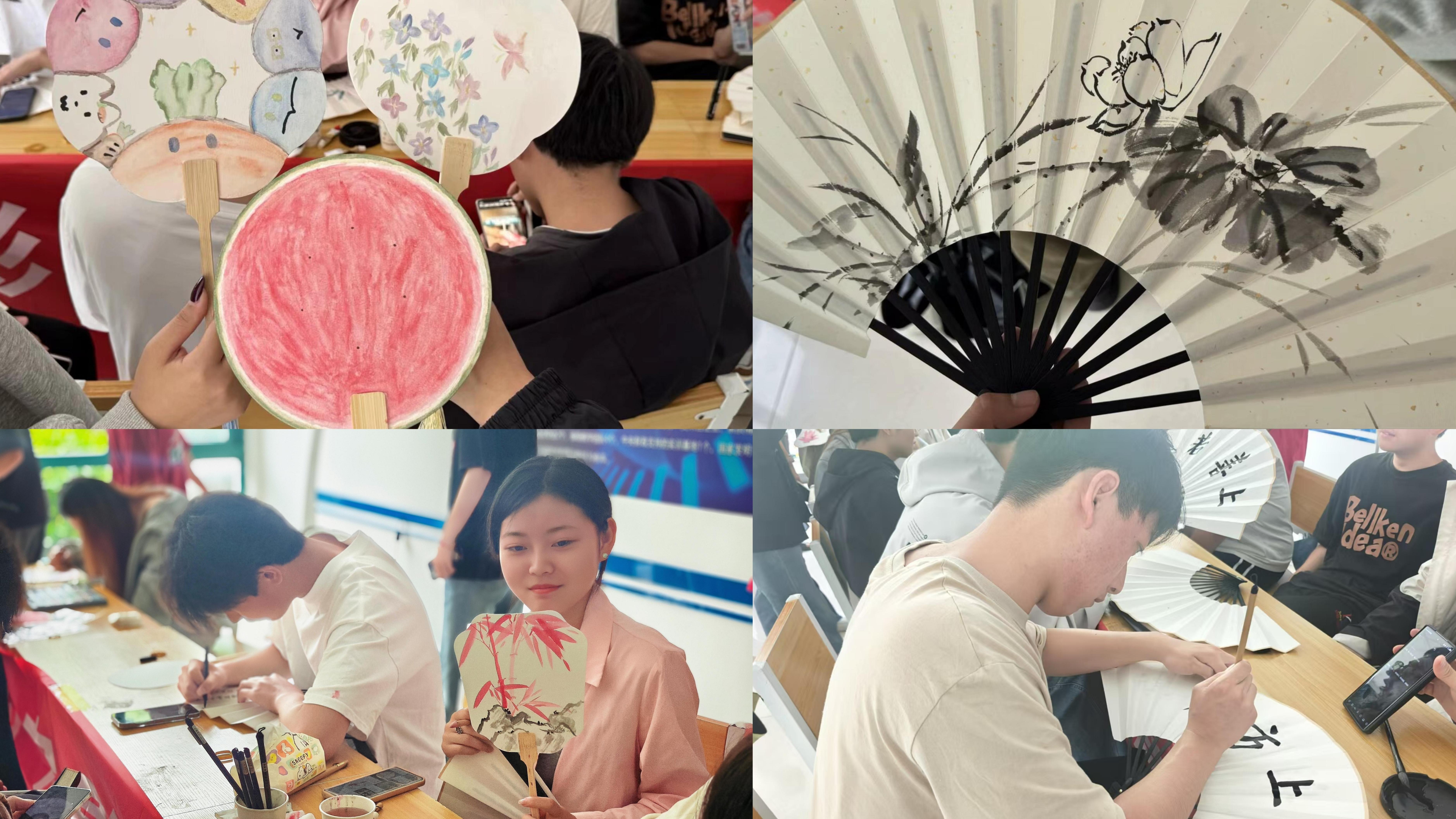 活动现场气氛热烈,同学们纷纷化身为创意匠人,有的执起画笔,在素白的扇面上勾勒心中所想,绘就一幅幅生动鲜活的图案;更有自发组成的志愿者团队,他们挥毫泼墨,不仅为同学们的扇面增添了雅致墨香,更传递了互助友爱的温暖情谊。这场活动为同学们开启了一场融汇匠心与美学的文化之旅,也让同学们深刻体会了手工艺术魅力和扇子文化内涵。