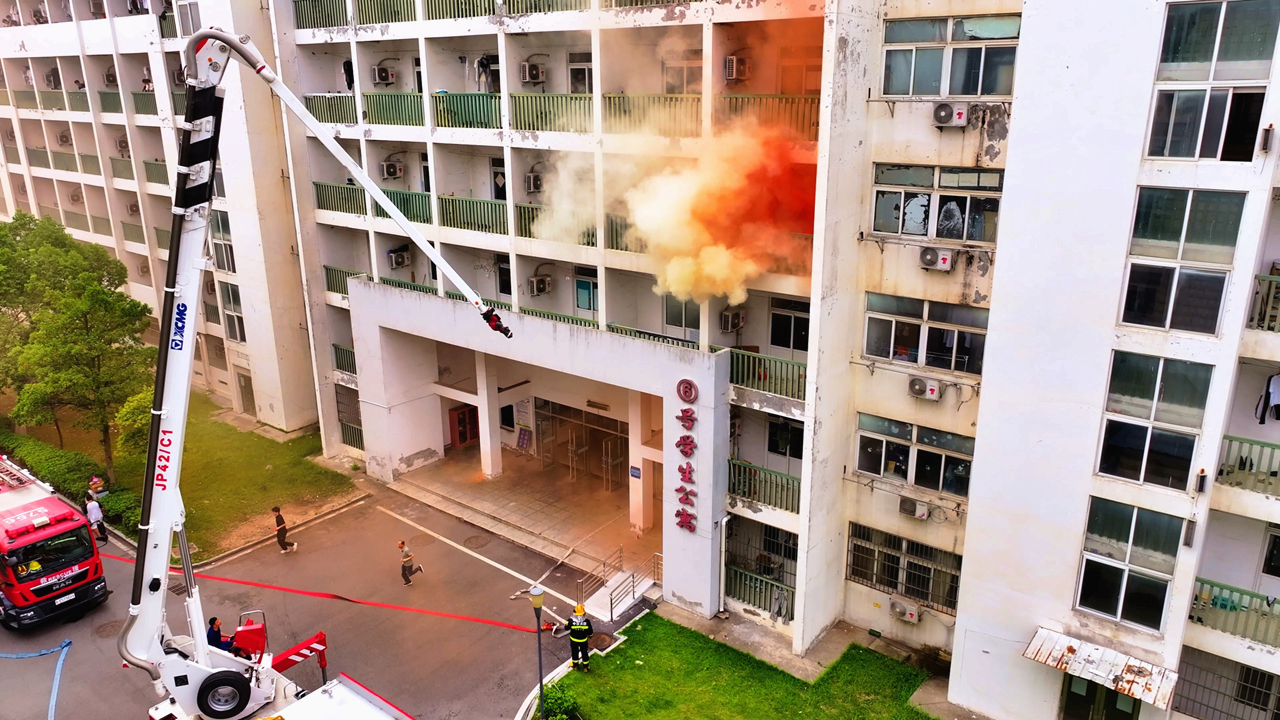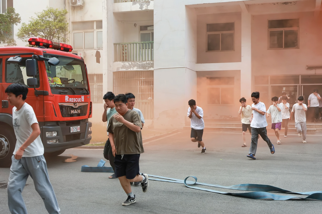 6月4日下午,6号宿舍楼突然浓烟滚滚,警报声骤然响起,楼内的同学们反应敏捷,迅速打湿毛巾、手帕等纺织物,捂住口鼻,防止吸入烟雾,弯腰低姿,采取正确的逃生姿势,沿着规定的疏散通道快速且有条不紊地撤离出“火场”。