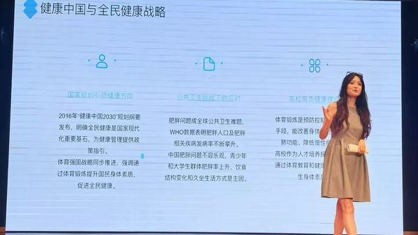 讲座以“健康中国 2030 规划”为政策背景,指出当前大学生超重率接近15%,久坐生活方式与饮食结构变化已成为健康管理的重要挑战。体重管理不是单纯的身材焦虑,而是生命质量的基础工程。她表示,高校需通过系统化健康干预,将体育教育与健康管理融入人才培养体系,助力学生建立科学生活习惯。他详解了“短期习惯养成 + 长期意识塑造”的双目标模型,以北京大学健康校园项目为例,说明系统干预对提升学生 BMI 正常率的实效;同时结合《柳叶刀》研究成果,阐明青年时期健康习惯对降低未来慢性病风险的长远意义。在实施路径上,讲座提出涵盖健康教育、个性化方案、动态监测及校园环境优化的整合模式,特别提到多校通过课程改革、技术赋能与环境改造推动健康管理的实践经验。