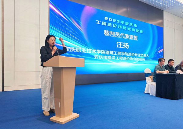 9月26日,安庆市工程造价技能竞赛(决赛),我校建筑工程学院教学管理工作负责人张赛,安庆市造价协会副会长、我校工程造价专业建设负责人汪扬受邀担任大赛评委。汪扬作为裁判员代表上台宣誓。充分展现了我校建筑专业教师团队的深厚的专业功底和服务地方发展的责任与担当。